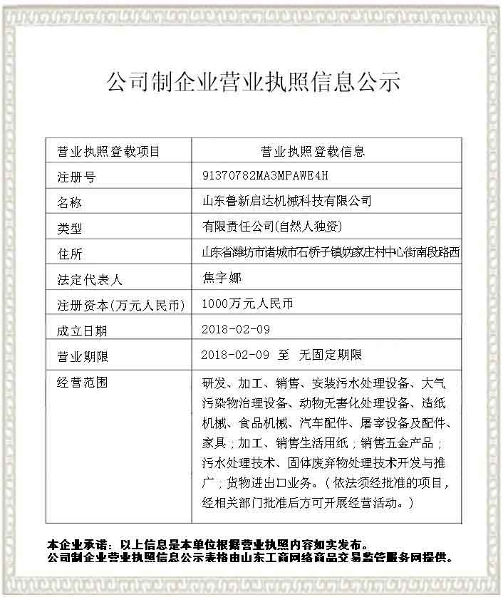 山東魯新啟達(dá)機(jī)械科技有限公司,坐落于沿海城市并有“中國(guó)龍城舜帝故里”之稱的諸城市石橋子鎮(zhèn)工業(yè)園,東鄰海濱名城青島,南毗新興港口城市日照,交通便利,環(huán)境優(yōu)美。主要經(jīng)營(yíng)屠宰機(jī)械、污水處理設(shè)備、食品機(jī)械等設(shè)備。